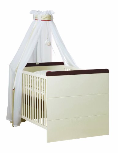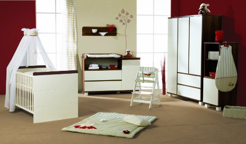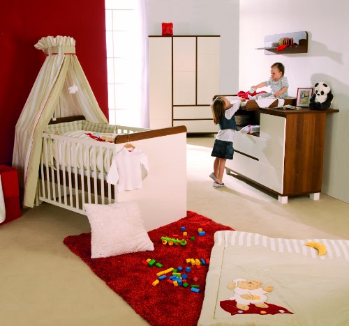 The modern and straightforward roba cot offers simplicity and Eleganz.Weiß painted MDF front panel with horizontal Zierfräsungen give the room a touch of extravagance. Contrasts in walnut color. Soft-close technology for the doors and drawers. Front and body with easy to clean plastic surface. Equipped with three sliding bars. The shelter staffs help the little people in due time the entry and exit. The slatted frame is height-adjustable. The bed can be quickly and easily to junior bed. Includes removable side panels.