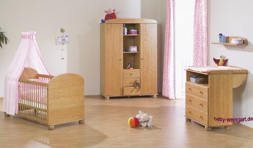 "Material: solid spruce stained on alder wood structure visible external measurements well: Description :3-piece with a cot, changing table and large wardrobe cot TÜV / GS tested outside dimensions: L 152 cm, W 80 cm, H 92 cmBeschreibung: mattress size 140 x 70 cm 3 removable bars slatted 3 height adjustable Umbaubar to junior bed, 2 removable side panels included Optional 4 reel chest external dimensions: L 75 cm and 48 cm, W 92 cm, H 102 cmBeschreibung : Winding height 94 cm winding approach removable 3 drawers, 1 open compartment TÜV / GS tested and wardrobe (large) Dimensions: T 58 cm, W 134 cm, H 193 cmBeschreibung: 2 doors, 3 drawers, 3 open compartments 8 partly adjustable shelves, 2 clothes rails delivery after payment is made by shipping from central warehouse - Delivery Time: 6 - 10 days delivery without Mattress, textile equipment or decorations supply of children's rooms only on advance payment, bank transfer or Paypal!